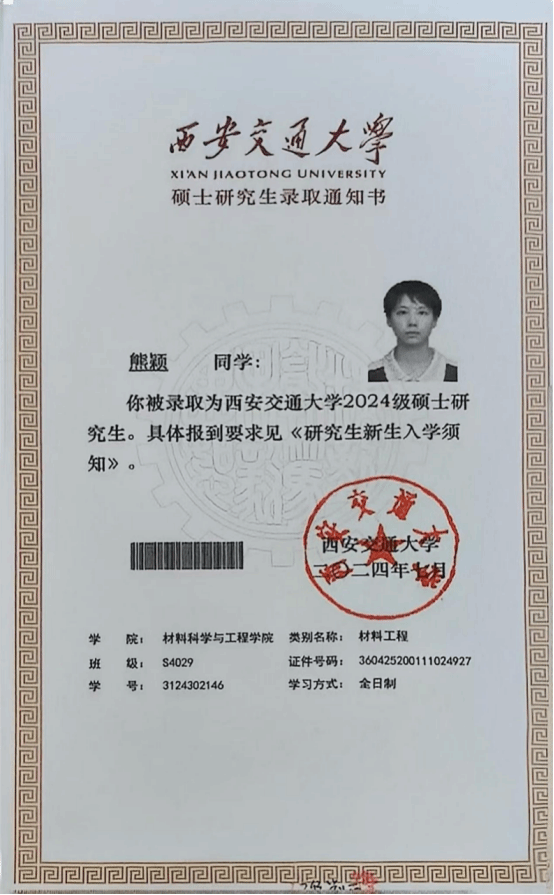 4 | 2001241020 | 熊颖 | 女 | 材料成型及控制工程 | 20材料1班 | 15779588710 | 西安交通大学 | 材料工程 | 985 | 是 | 是 |
