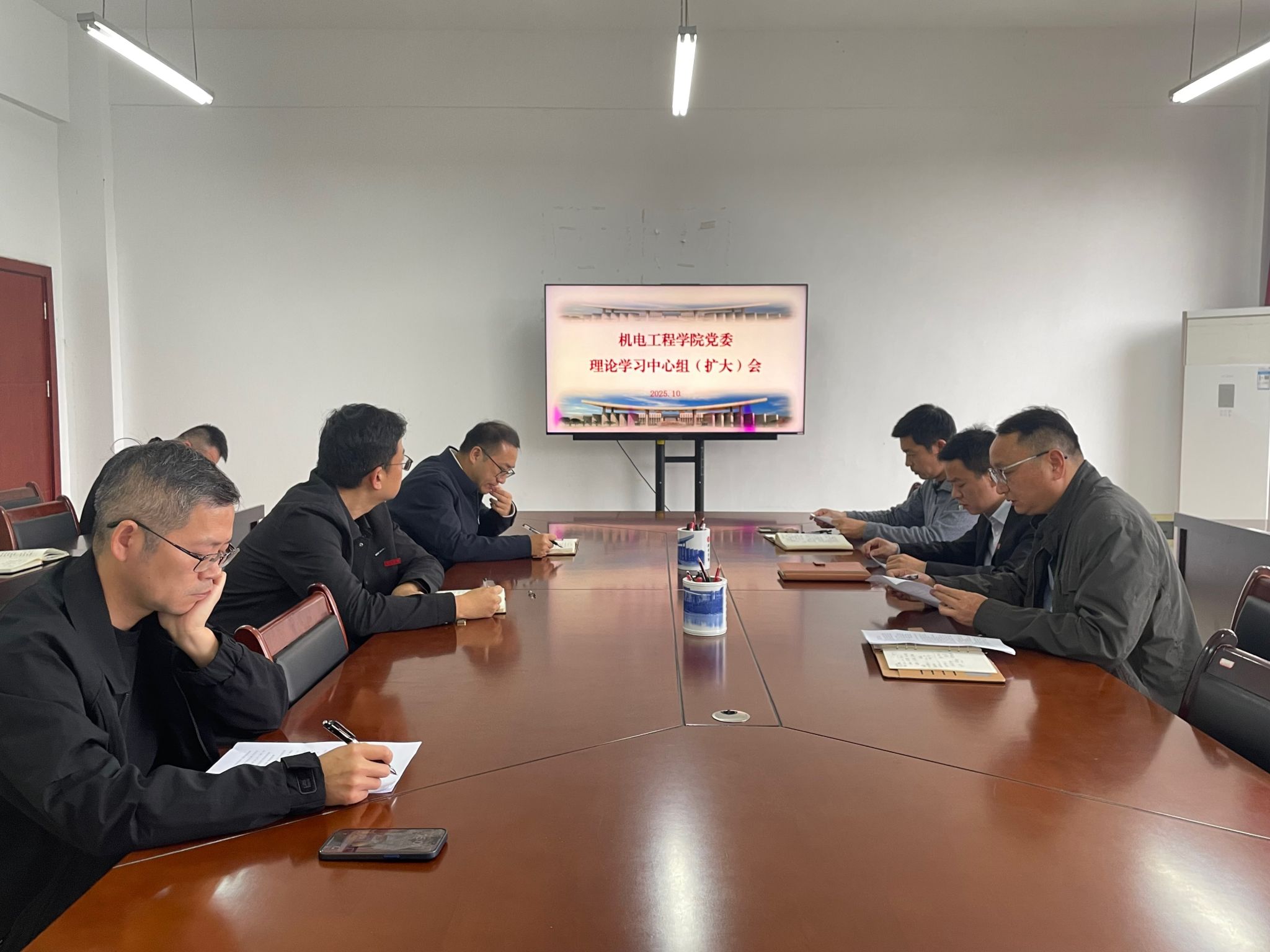 10月31日,机电工程学院召开党委理论学习中心组(扩大)学习会,传达学习党的二十届四中全会精神,深入学习贯彻《习近平谈治国理政》第五卷,并结合学院中心工作开展学习研讨。学院班子成员、各科室负责人等参加会议,会议由学院党委书记杨国军主持。