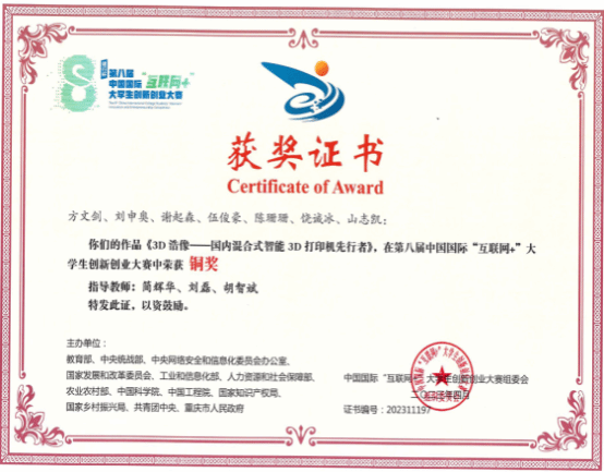 2023 | 中国国际“互联网+”大学生创新创业大赛 | 3D浩像-国内混合式智能3D打印机先行者 | 全国铜奖 |