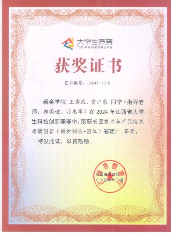 2024 | 全国大学生先进成图技术与产品信息建模创新大赛 | 增材制造赛道 | 省级二等奖 |