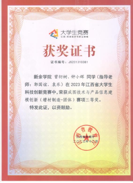 2023 | 全国大学生先进成图技术与产品信息建模创新大赛 | 增材制造赛道 | 省级三等奖 |