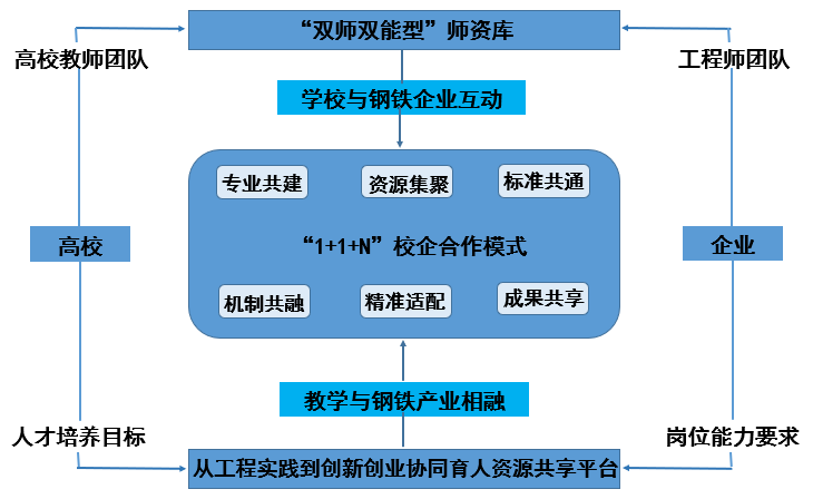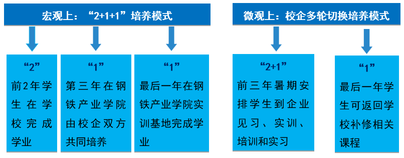钢铁产业学院将企业资源和职场要素融入教育教学全过程,本着立德树人、以生为本、工程教育基本理念,构建“八共一体”育人新模式及“2+1+1+校企多轮切换”人才培养模式。